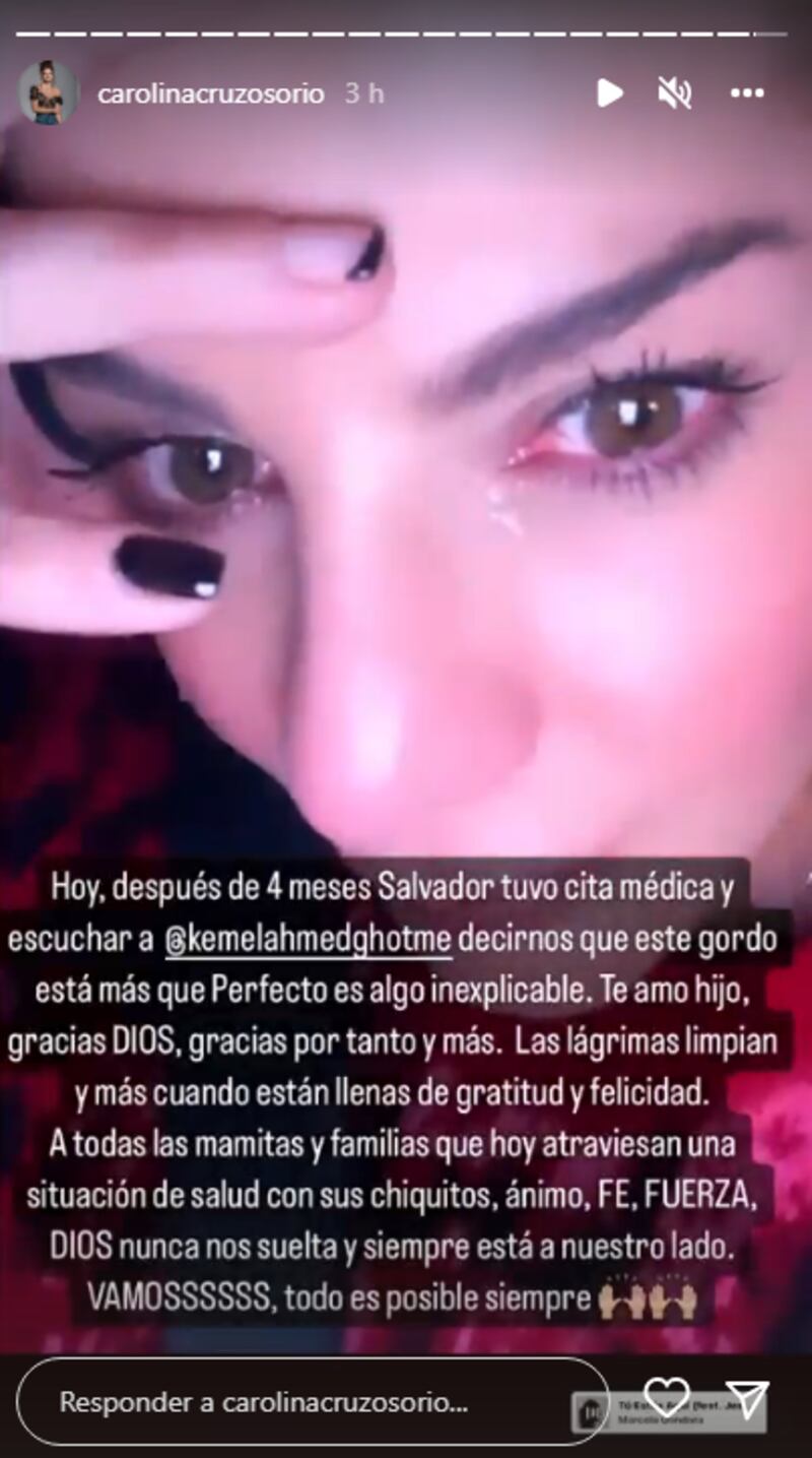 “Hoy, después de 4 meses Salvador tuvo cita médica y escuchar que este gordo está más que perfecto es algo inexplicable”, comentó la presentadora en una historia de Instagram mientras mostraba lo emotiva que estaba. “Las lágrimas limpian y más cuando están llenas de gratitud y felicidad”.