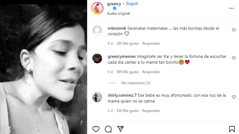 “Serenatas maternales … las más bonitas desde el corazón”, “Imagínate ser Kai y tener la fortuna de escuchar cada día cantar a tu mamá tan bonito” y “Ese bebé es muy afortunado, con esa voz de la mamá quién no se calma”, son algunos de los mensajes que dejaron los seguidores de Greeicy Rendón en la publicación.