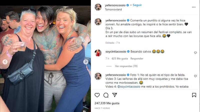 A través de una publicación en su cuenta de Instagram, Yeferson Cossio resumió algunos de los momentos más divertidos y peculiares del tercer día de su experiencia en Tomorrowland, mostrando varias fotos y videos donde destacaba la música y la buena energía con su hermana y sus amigos.