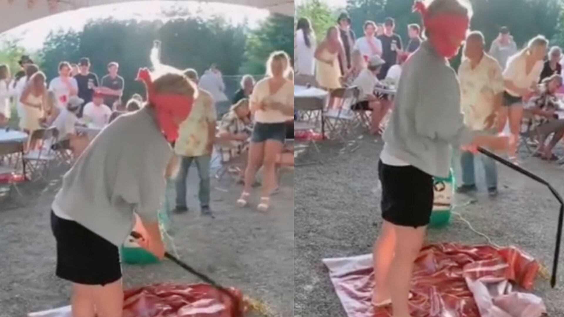 El palo se ve totalmente torcido y aun así el cumpleañero no se daba cuenta, así que otro asistente decidió quitarle el palo antes de causar más golpes. Lo más impactante de todo, es que pareciera que muchos de los presentes, ni siquiera se preocuparon por el bienestar de la mujer, qué término por levantarse sola y como si nada.