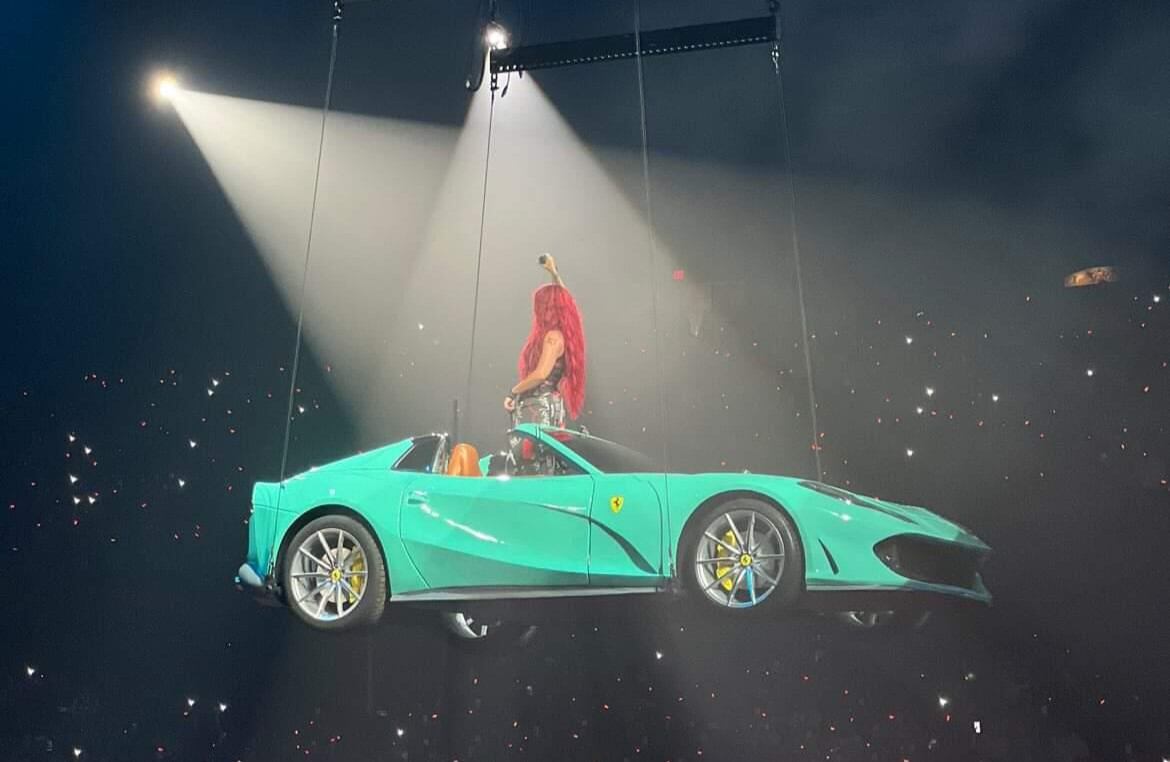 Y es que ‘La Bichota’ hizo su entrada de una manera asombrosa sobre un Ferrari que, sujetado por unas fuertes cuerdas de seguridad, voló sobre parte del escenario y del público presente.