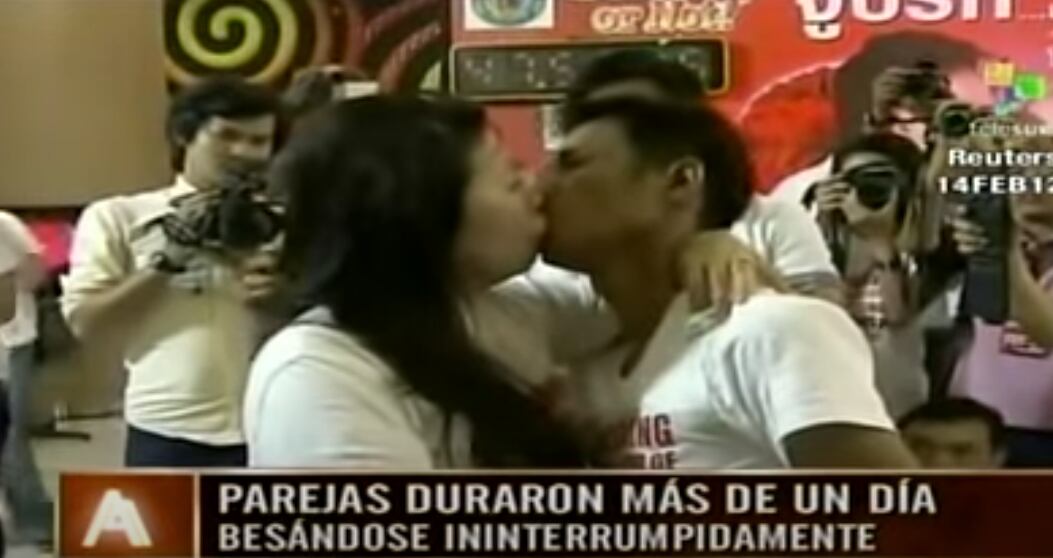 El beso que sucedió en el 2013, Ekkachai y Laksana Tiranarat, de Bangkok Tailandia. La pareja ya había impuesto un récord en el 2011, pero definitivamente, en el 2013, dejaron sin aliento a todos. Iniciaron nueve parejas compitiendo, pero poco a poco, fueron quedando menos. Lo difícil del asunto es que no podían sentarse, ni separarse, ni comer, y cuando tenían que ir al baño, lo hacían juntos.
