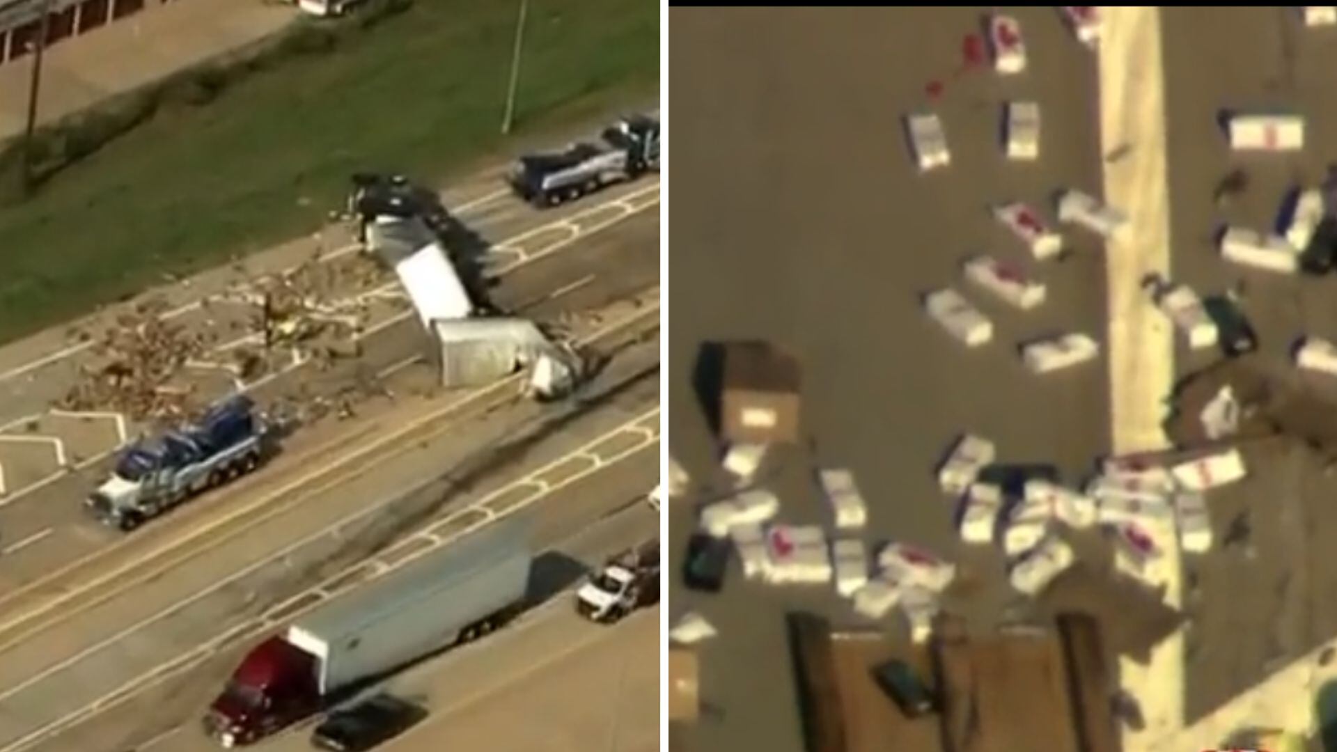 En el hecho sucedido en Oklahoma todo parecía normal, en cuanto a lo que cabe decirle normal al volcamiento de un tractocamión bloqueando toda una avenida. En las imágenes que se pueden ver desde el helicóptero se evidencia al gran camión atravesado en todos los carriles bloqueando el tráfico totalmente.