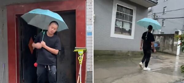 En las imágenes se observa cómo el joven, de origen oriental, toma la sombrilla tradicional y con cinta pegante le une dos ganchos metálicos al tubo, luego los separa, dejando hacia adelante la parte superior y se los pone en cada brazo, como su fueran las mandas de una chaqueta. Los picos del ganchos los utiliza para colgar una bolsa y así tener las manos libres.