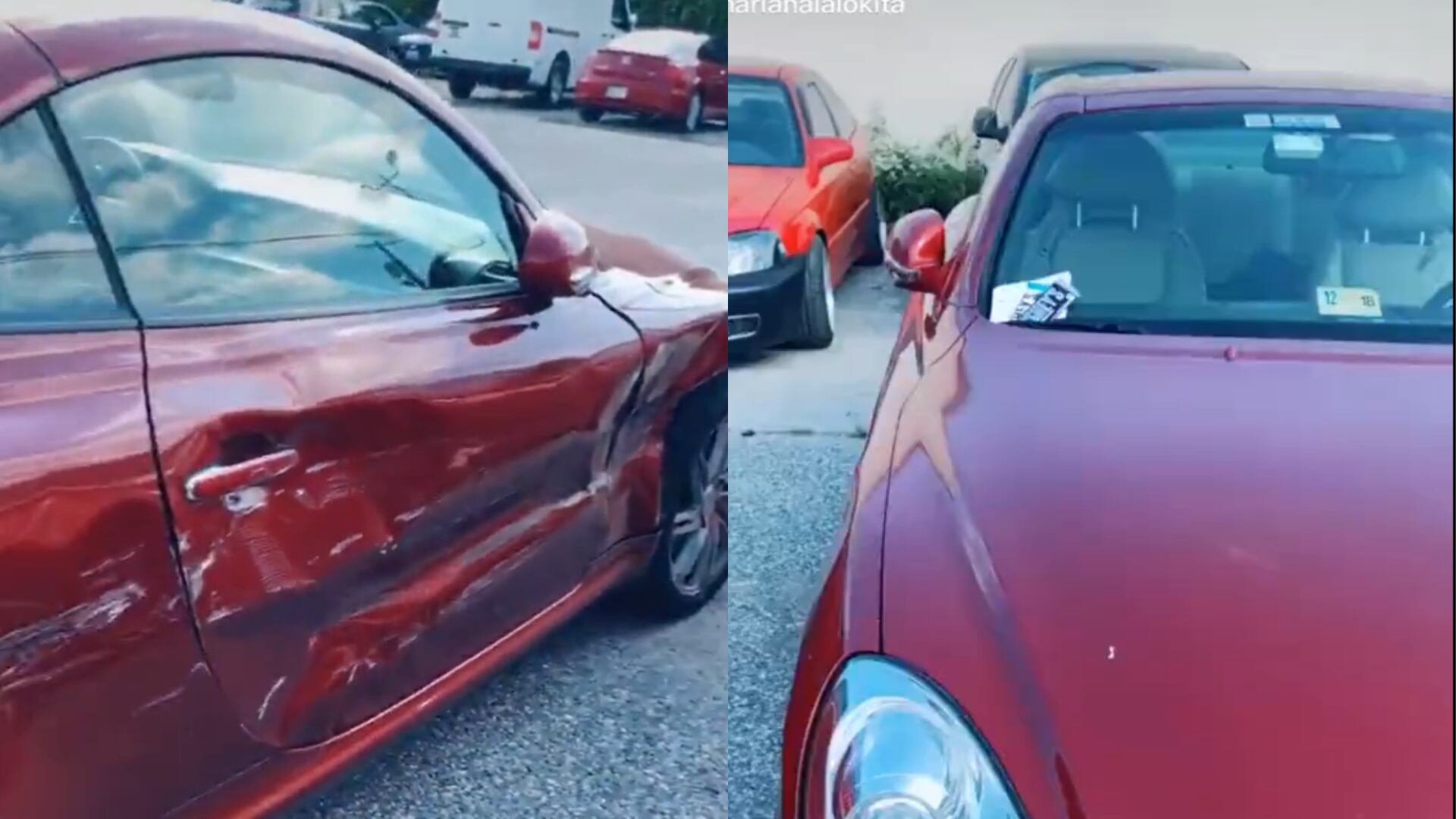 “Yo fui a Walmart (un supermercado) y encontré esto en mi carro que dice “Lo siento por dañar tu carro. No puedo arreglarlo, pero acá hay un chocolate a cambio… Y este es el daño que tiene mi carro”. Expresó la mujer.