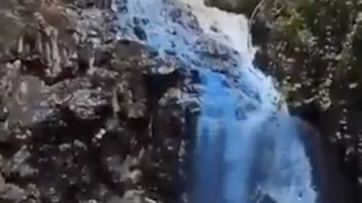 La pareja se encontraba al lado de una cascada y desde arriba, decidieron lanzar un químico especial para que se tiñera de azul, mientras ellos se abrazaban.
