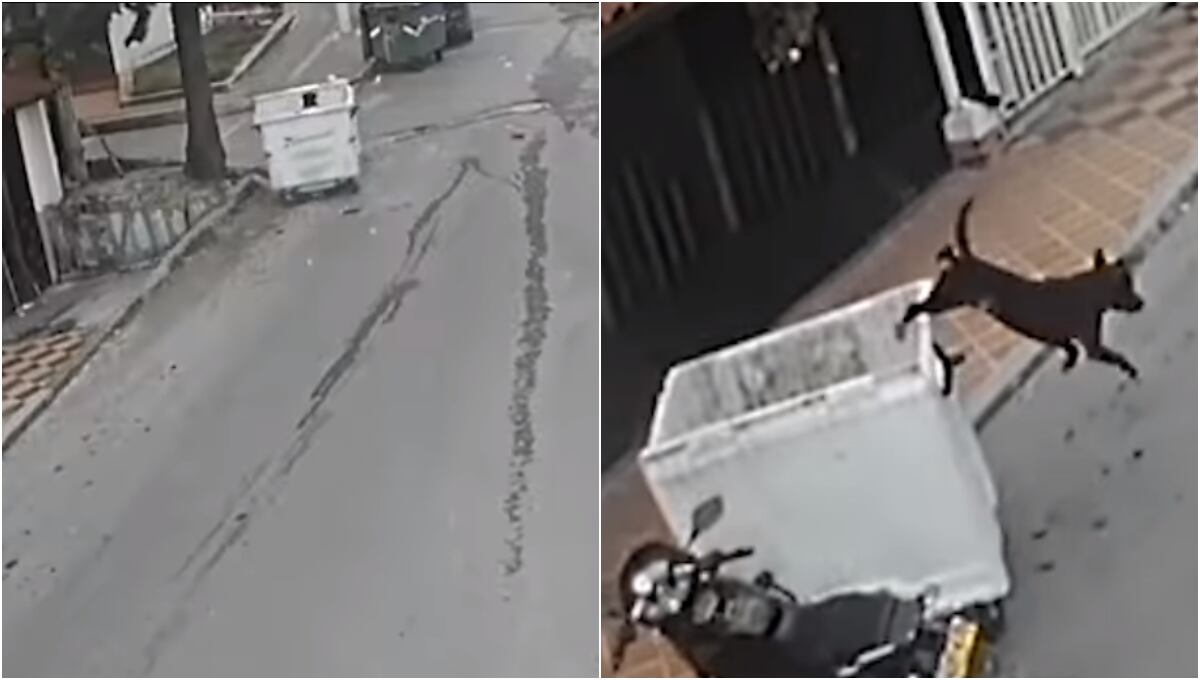 En una curiosa e inédita escena, un perro a bordo de un contendor de basura causó un pequeño accidente al ‘atropellar’ una motocicleta que se encontraba estacionada y de inmediato huyó del lugar sin dejar evidencias, pero las cámaras de seguridad del sector lo dejaron en evidencia.
