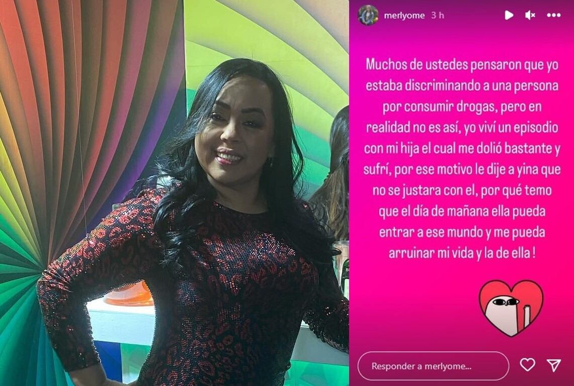 “Muchos de ustedes pensaron que yo estaba discriminando a una persona por consumir drogas, pero en realidad no es así, yo viví un episodio con mi hija el cual me dolió bastante y sufrí, por ese motivo le dije a Yina que no se juntara con él, porque temo que el día de mañana ella pueda entrar a ese mundo y me pueda arruinar mi vida y la de ella”, escribió Merly Ome.