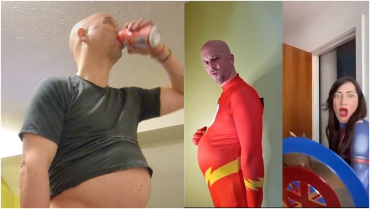 Dentro de sus puestas en escena sorprende incluso con disfraces de superhéroes que resultan ‘embarazados’ inusualmente.