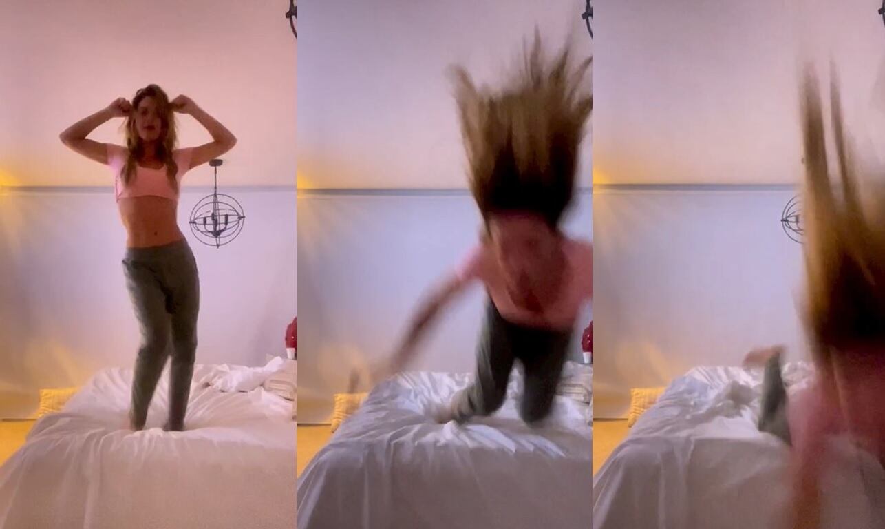 La bella actriz estaba dentro de su habitación disfrutando del éxito de la sensación española Rosalía, el tema ‘Despechá’, y lo hacía de una manera muy enérgica, pues lejos de repetir el trend, que se volvió viral en redes sobre la canción, lo que hacía era brincar.