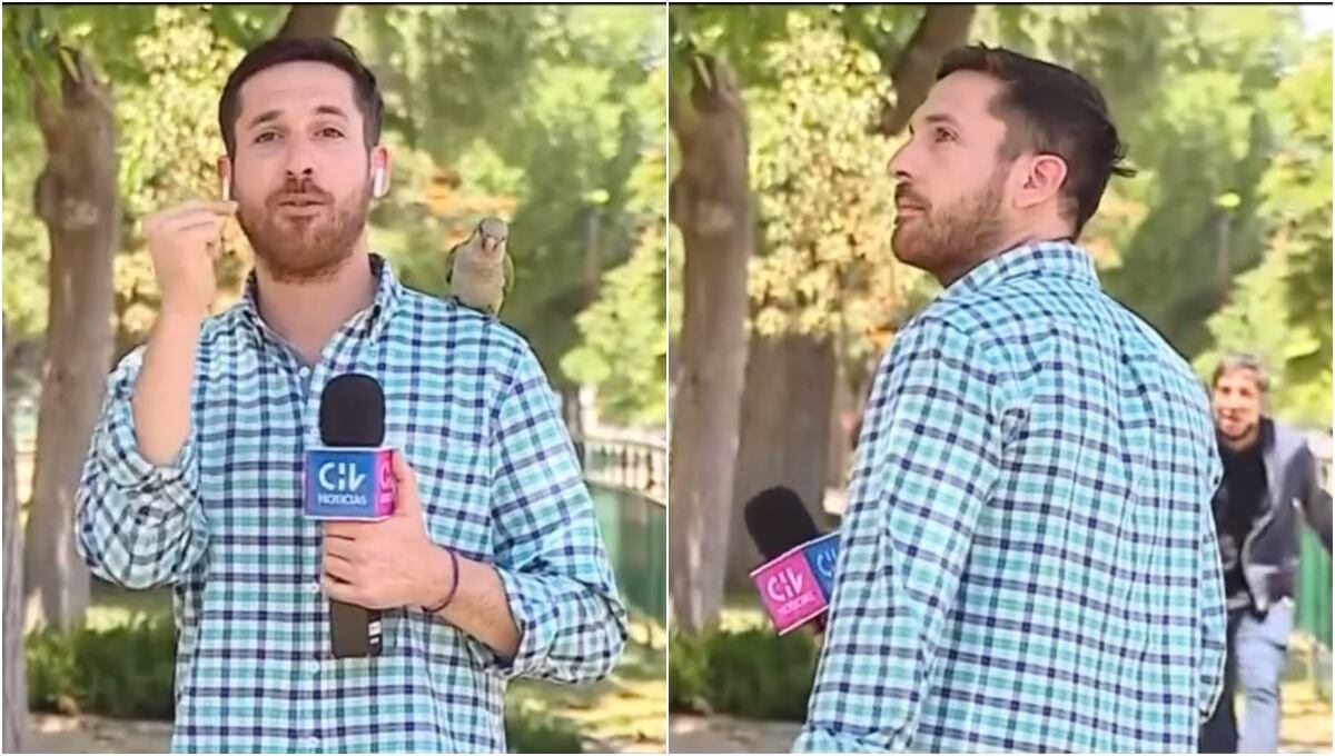 Cuando se encontraba realizando su informe, el periodista vio que el ave se le posó sobre su hombro, algo que le llamó la atención, pero estaba lejos de imaginar las intenciones que tenía el animalito.