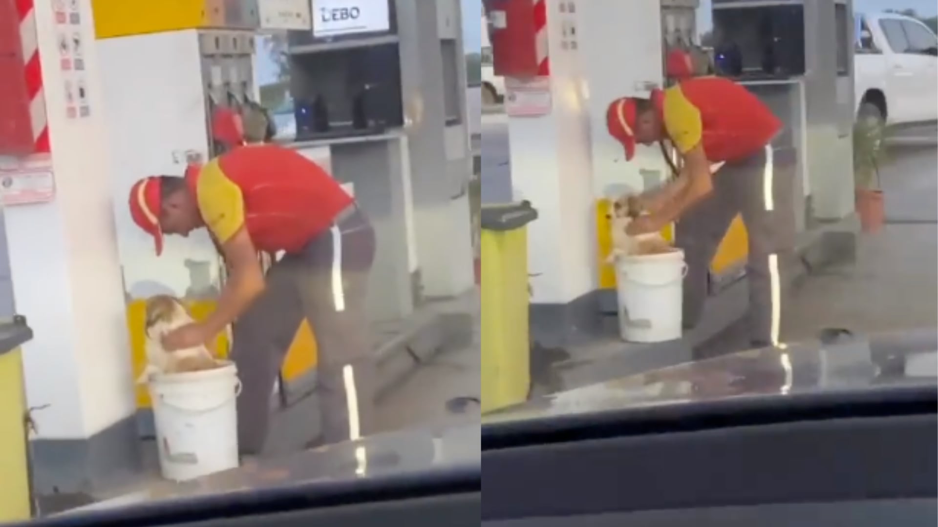 En el video se ve como un trabajador, de nombre, Matías Saldari, le echa agua de manera gentil a Ricky. Un perro de la calle que suele pasar seguido en la estación de servicio.