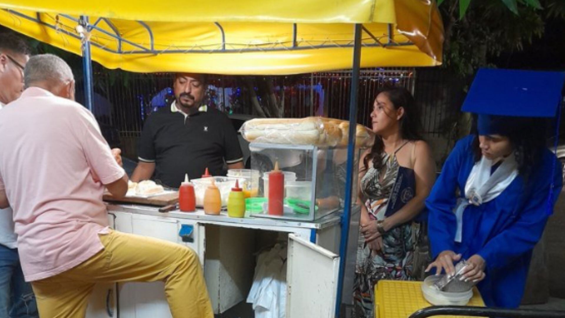 Esto queda perfectamente reflejado en una foto compartida en la red social Twitter por el usuario ‘Guille Rondón’. Junto a la foto el ‘tuitero’ escribió “La recien gradudada no soltó su toga y birrete para ayudar a su padre en la venta de perros calientes callejeros. Por el contrario, se veía orgullosa, emanaba gratitud por quien seguro vela a muerte por su mejor futuro”.