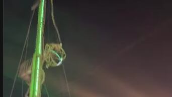Cuando el señor accionó la máquina, el resorte se encogió, pero en vez de ir de arriba para abajo, una de las cuerdas se soltó, por ende, solo quedó colgando de un lado. El círculo verde, donde estaban las dos personas sentadas, se golpeó fuertemente con el lado de la estructura derecha y empezó a rebotar.