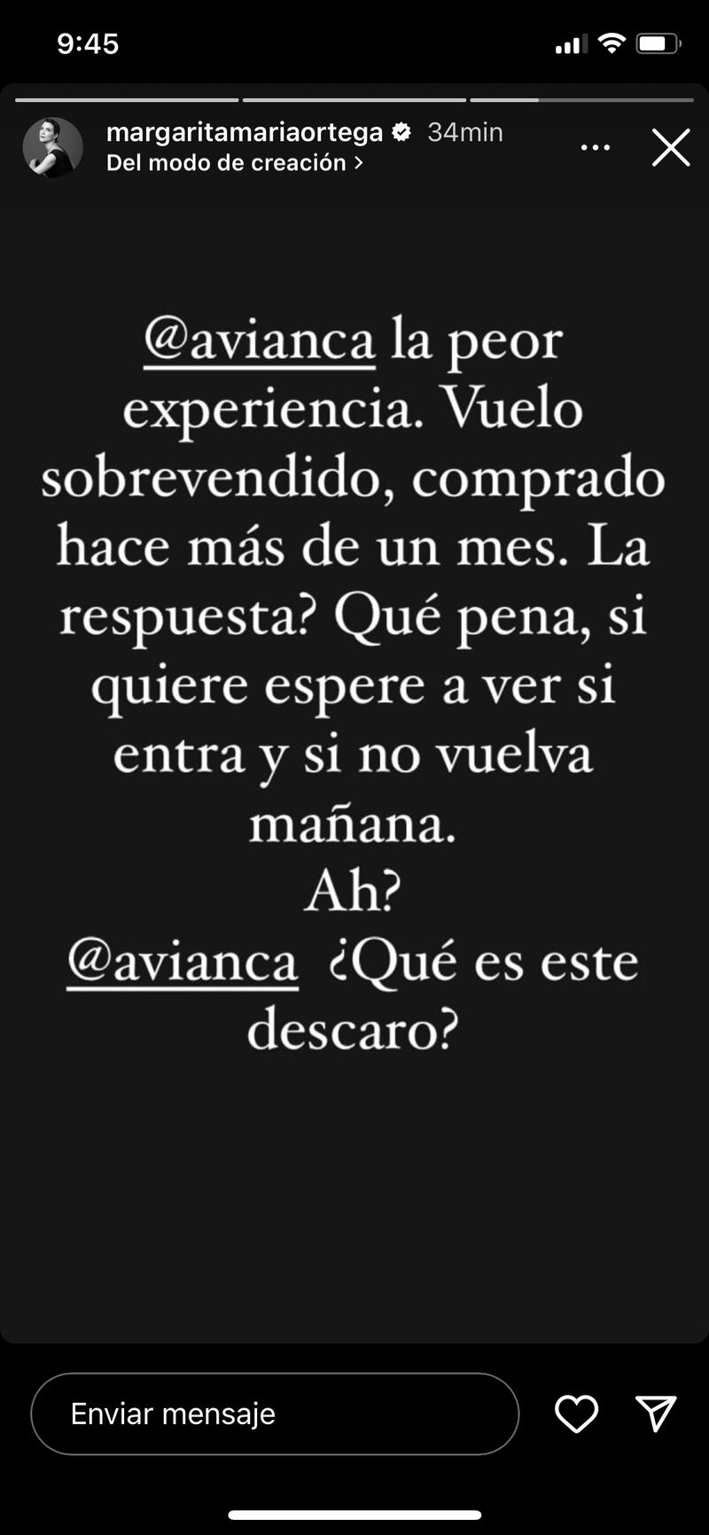 El hecho se habría producido en horas de la tarde de este domingo 26 de febrero. Margarita aseguró: “Avianca la peor experiencia, vuelo sobre vendido, comprado hace más de un mes”. Seguidamente, reiteró que al buscar una respuesta su molestia, al parecer, resultó aún mayor. Pues, los encargados le pidieron disculpas, pero aseguraron que tenía que esperar si el siguiente vuelo contaba con puestos disponibles y si no tendría que volver al día siguiente.