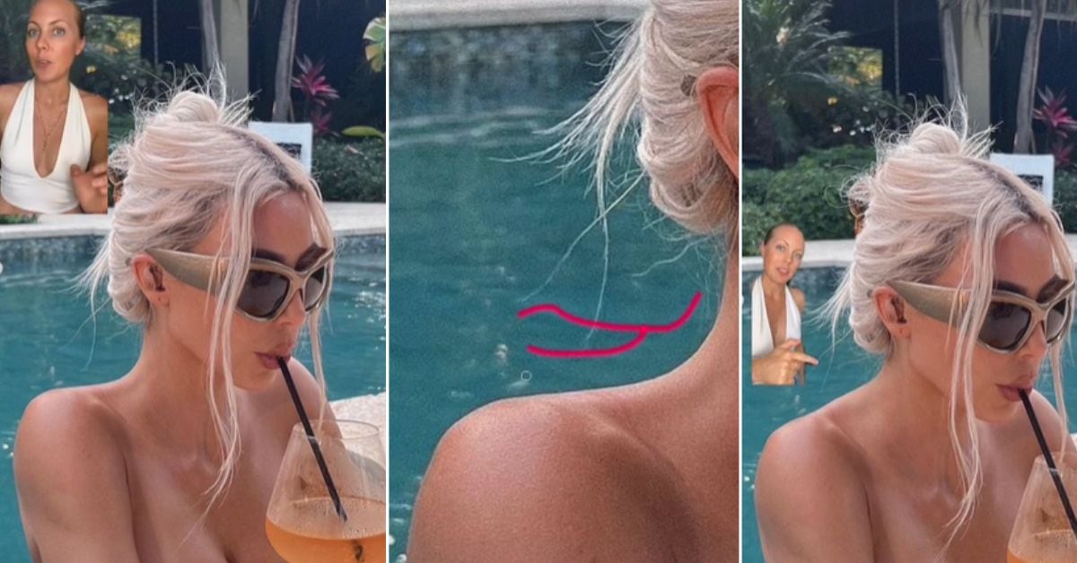 Caroline hizo énfasis en el cuello y hombro de Kim y comenzó a editar “en reversa” para hacer notar que había un músculo completo que faltaba en esa zona, hasta dar con la supuesta imagen original, reseñó el portal Upsocl.