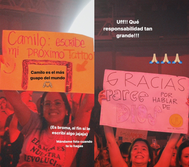 Otro cartel que llamó la atención de Camilo estuvo más orientado a su fe y su religión, el cual decía: “gracias, parce, por hablar de Dios”. A través de sus historias también publicó la imagen de su seguidora junto con el mensaje: “Uff!! Qué responsabilidad tan grande!!!”.
