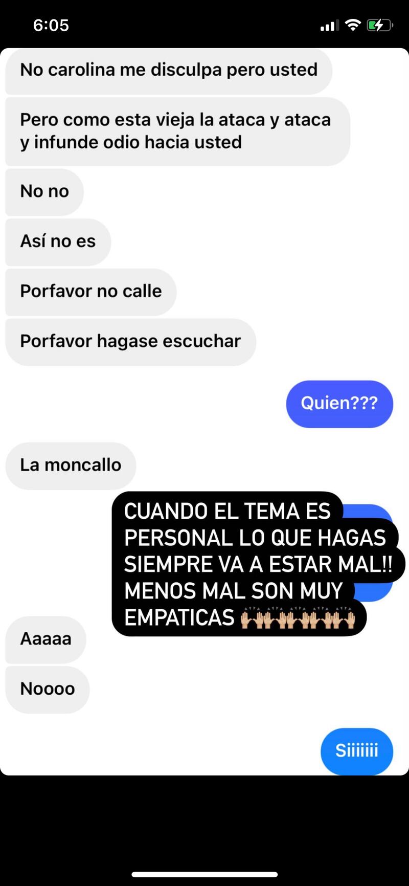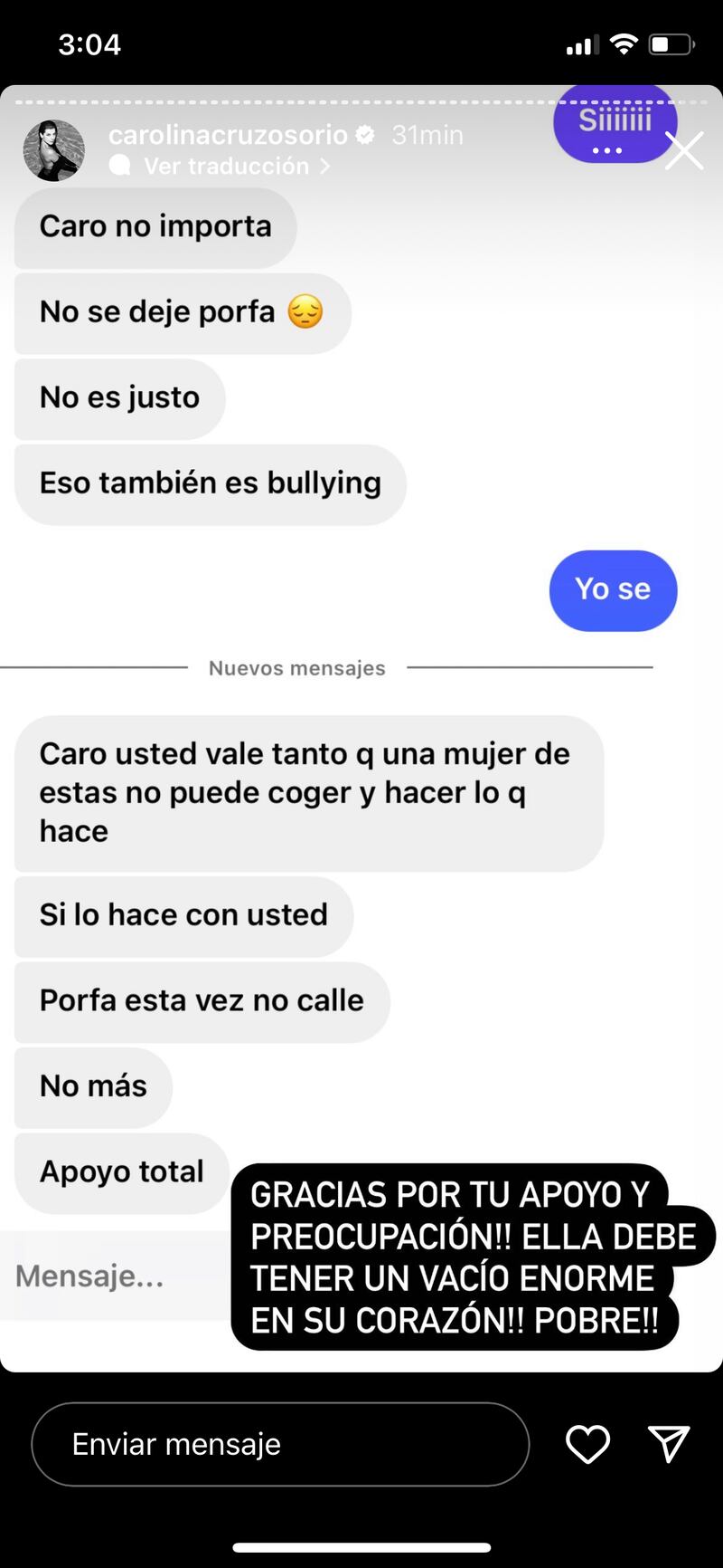 Y es que sus cortas declaraciones no terminaron allí, pues en las últimas horas Carolina ha seguido compartiendo los mensajes de aquellas mujeres que le apoyan y al parecer, volvió a referirse a Moncayo: “Gracias por tu apoyo y preocupación. Ella debe tener un vacío enorme en su corazón, pobre”.
