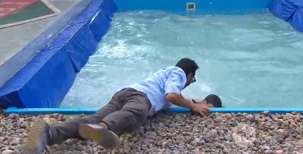 Esta vez fue en el box azul, y una decisión del mismo participante quien debía bajar por las escaleras o simplemente lanzarse a la piscina profunda, solo que quiso caer sobre el concreto y nada le salió bien.