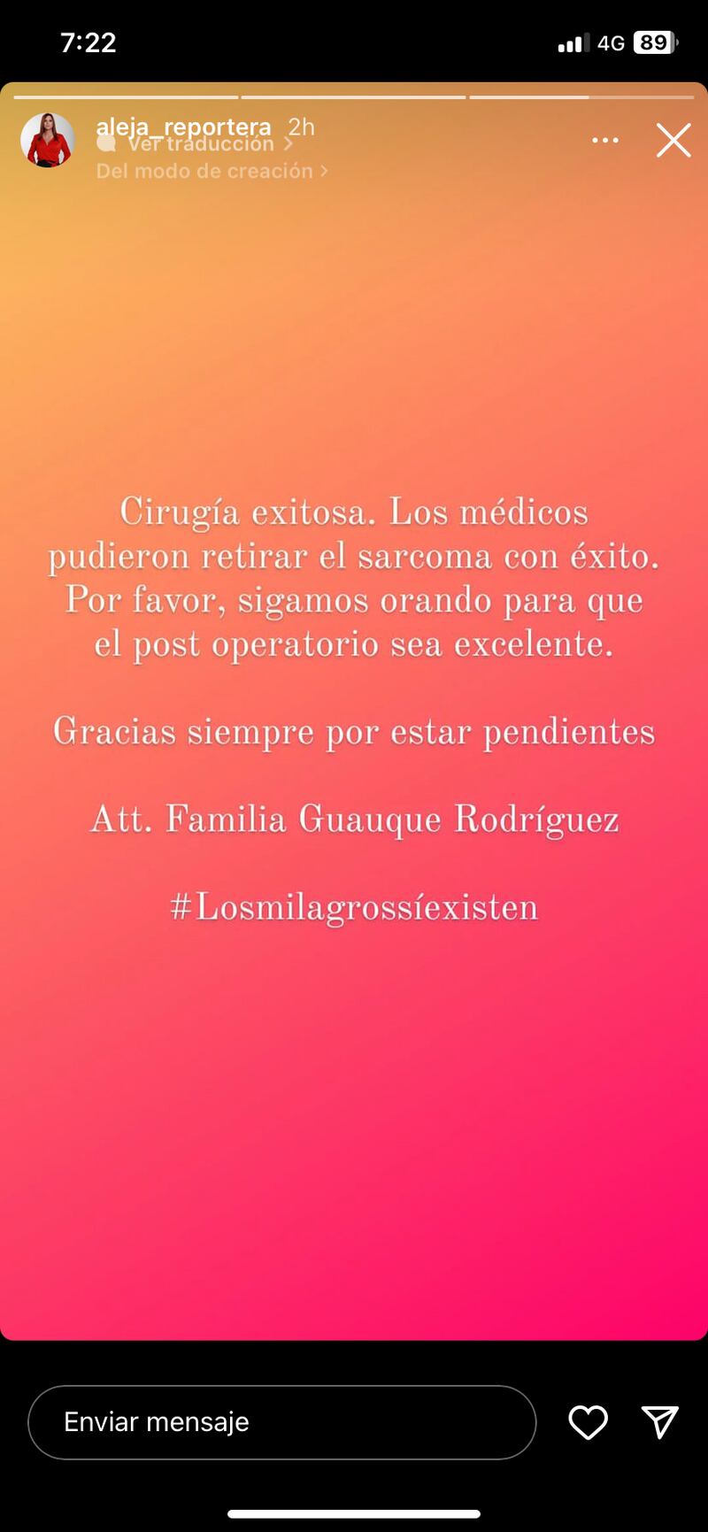 A través de su cuenta en Instagram, Alejandra Rodríguez dijo que la cirugía fue exitosa.