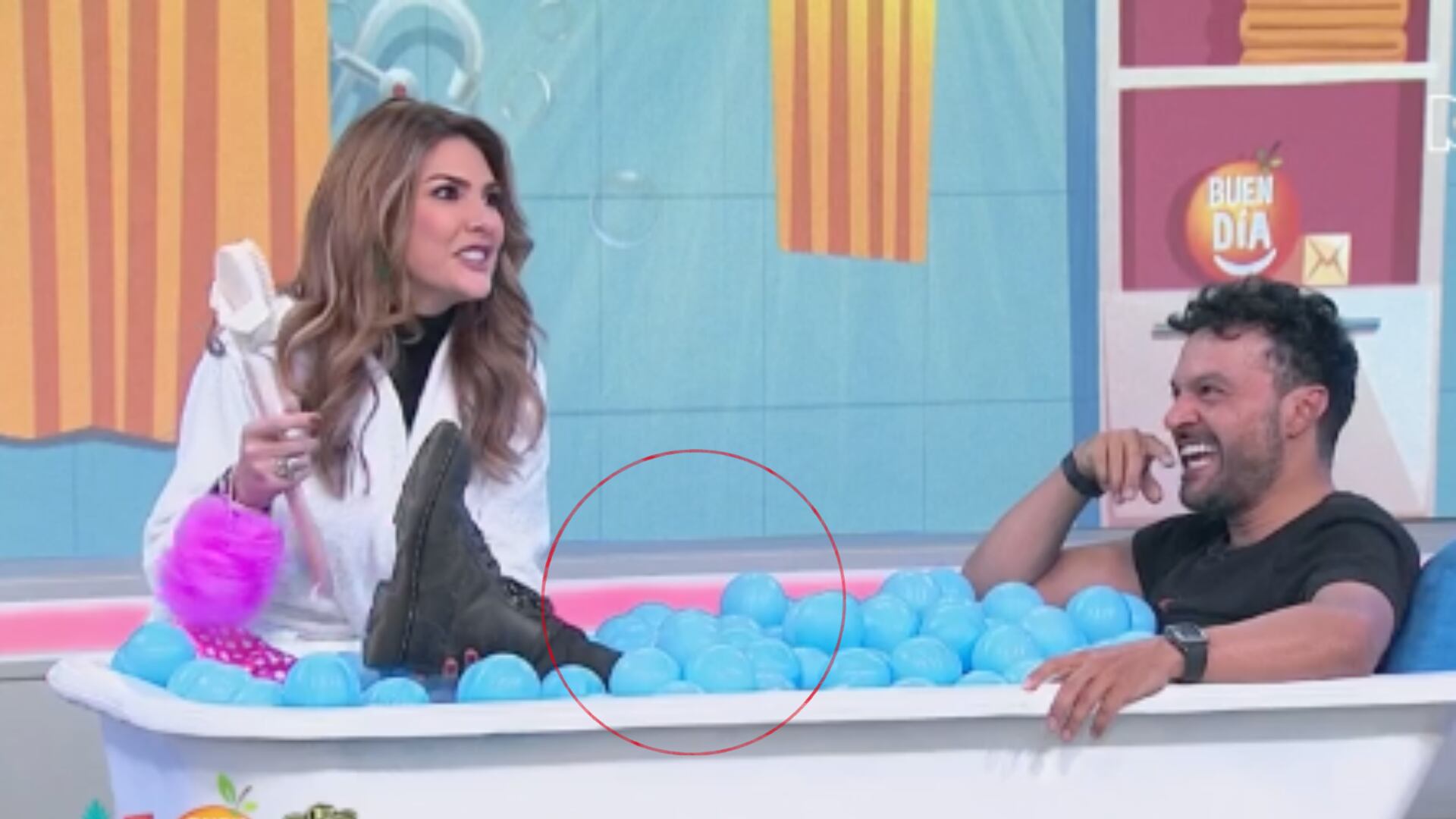 Mientras hacía la mímica de colocarle jabón por todo el cuerpo, la presentadora sufrió una caída que hizo dirigir su mano a las piernas de Julián; y entre ‘chiste y chanza’ la presentadora insinuó que por poco y le coge la pierna que no era. Inmediatamente, el hombre que protagonizó la serie biográfica del cantante Juan Gabriel gritó: “me va a acabar el matrimonio”, hecho que desató carcajadas en el set.