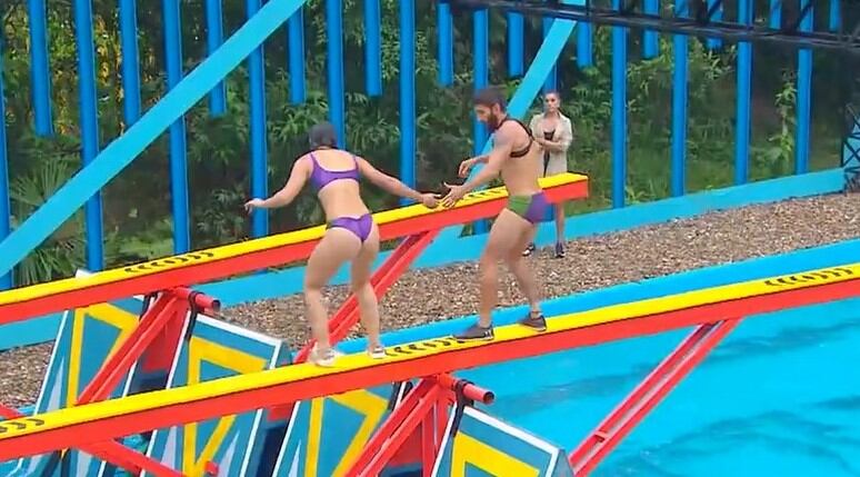 La prueba constaba de varios obstáculos como atravesar dos grandes troncos de equilibrio para lanzarse al rectangular acuático del box. Allí esperaba una balanza gigante en la que con contrapeso cada pareja debía retirar discos que estaban dentro de una cesta en la parte más alta del box. La complejidad se veía más absoluta y así lo fue. Beta falló al elegir a las parejas, pues Juli y Escudero lo intentaron varias veces mientras Alpha cobraba ventaja.