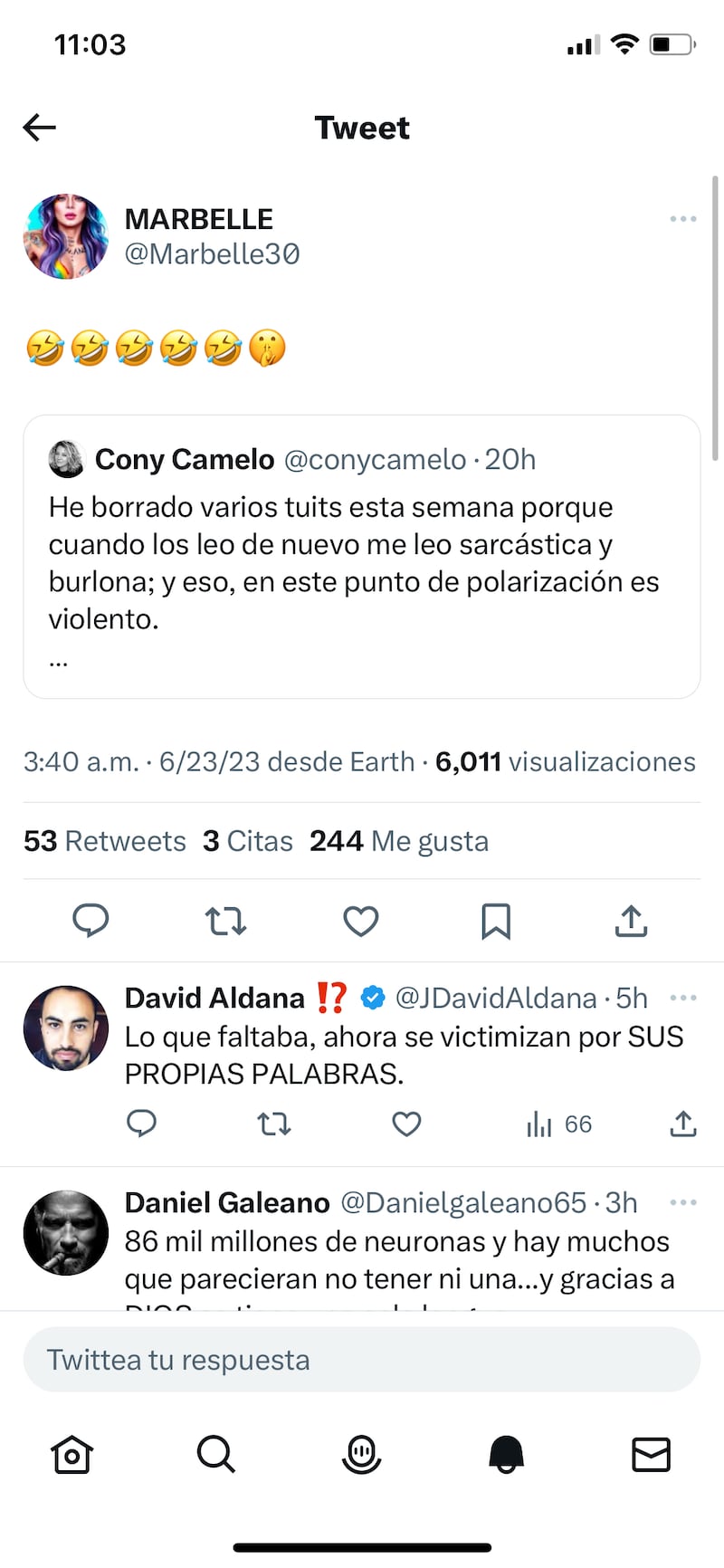 Por su parte, Marbelle como es costumbre no pierda ninguna oportunidad y en tono burlesco y hasta pidiéndole silencio terminó retuiteando las declaraciones de Camelo quien horas antes aseguró: “He borrado varios tuits esta semana porque cuando los leo de nuevo me siento sarcástica y burlona”. Asimismo, Cony reiteró que teniendo en cuenta las condiciones actuales de polarización en las que se encuentra el país.
