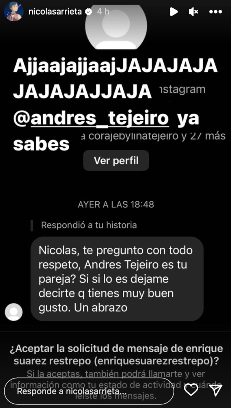 “Nicolás, te pregunto con todo respeto, ¿Andrés Tejeiro es tu pareja?, si sí lo es, déjame decirte que tienes muy buen gusto”, a lo que Nicolás no pudo evitar etiquetar a Andrés Tejeiro y burlarse de la situación, incluso comentando con un “ya sabes”, insinuando algo más con el hermano de Lina.
