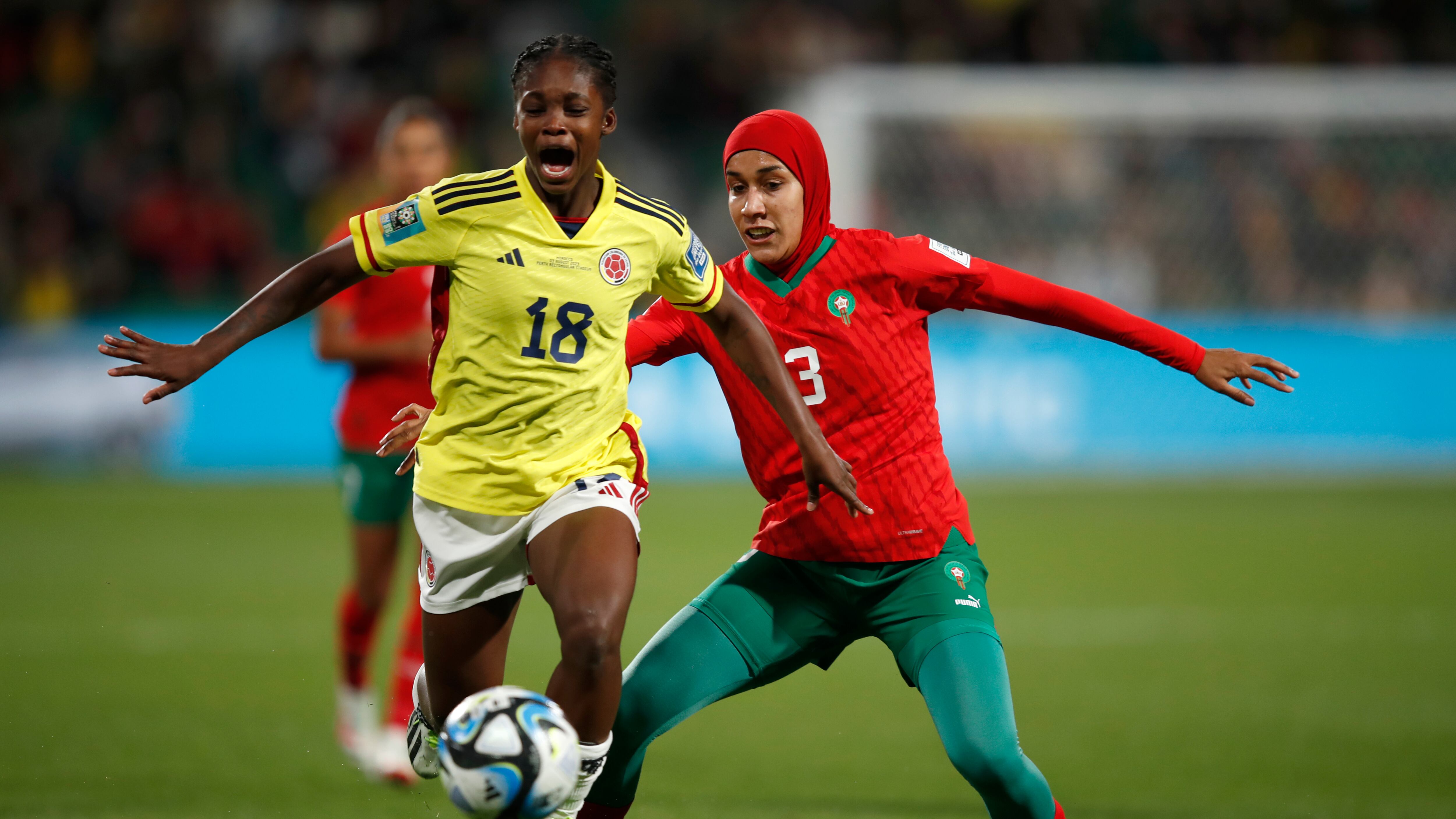 La delantera colombiana Linda Caicedo (izquierda) pugna el balón con la marroquí Nouhaila Benzina durante el partido del Grupo H del Mundial femenino, el jueves 3 de agosto de 2023, en Perth, Australia. (AP Foto/Gary Day) AP (Gary Day/AP)