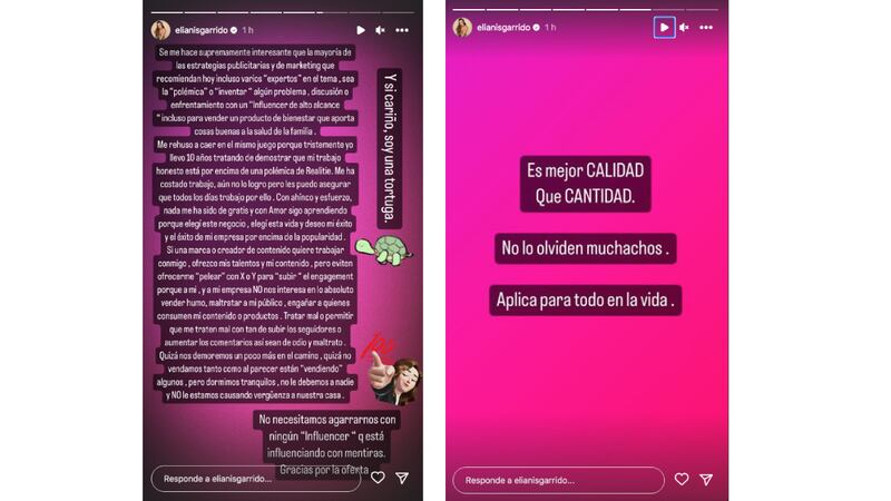 También mencionó que para ella está primero su éxito profesional y el de su empresa que la popularidad que logre con sus contenidos, aclarando que, “si una marca o creador de contenido quiere trabajar conmigo, ofrezco mis talentos y mi contenido, pero eviten ofrecerme “pelear” con X o Y ara “subir” el engagement porque a mí y a mi empresa NO nos interesa en lo absoluto vender humo, maltratar a mi público. Tratar mal o permitir que me traten mal con tal de subir los seguidores o aumentar los comentarios así sean de ocio o maltrato”.