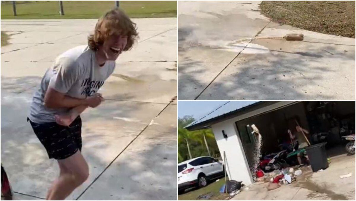 Luego de caer y rebotar, la botella que queda a unos buenos metros de quien la arrojó, se convierte en todo un misil de propulsión a gas que se devolvió rumbo a la dirección que fue lanzada y fue a dar directamente contra el joven.