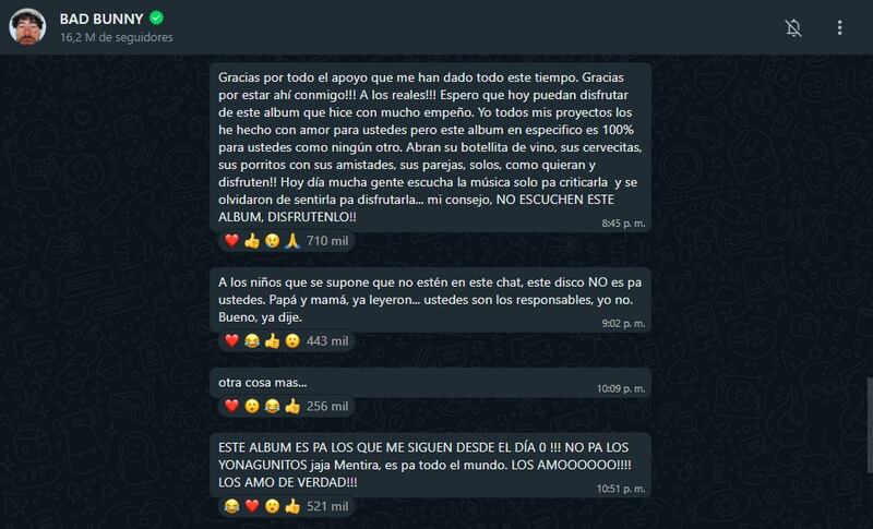 “Gracias por estar ahí conmigo. A los reales. Espero que hoy puedan disfrutar de este álbum que hice con mucho empeño. Yo todos mis proyectos los he hecho con amor para ustedes, pero este álbum en específico es 100% para ustedes como ningún otro. Hoy día mucha gente escucha la música solo pa criticarla y se olvidaron de sentirla pa disfrutarla... mi consejo, no escuchen este álbum, disfrútenlo. A los niños que se supone que no estén en este chat, este disco no es pa ustedes. Papá y mamá, ya leyeron... ustedes son los responsables, yo no. Bueno, ya dije”, escribió el cantante en su comunidad de WhatsApp momentos antes del lanzamiento.
