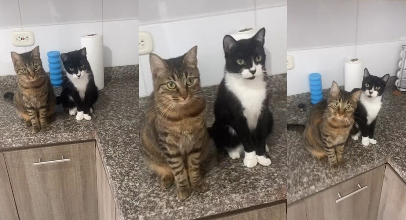 Los simpáticos michis llevan por nombre Luigi y Dalí, quienes sentados muy atentos sobre la superficie de la cocina observan detalladamente cada una de las instrucciones que el joven les da.