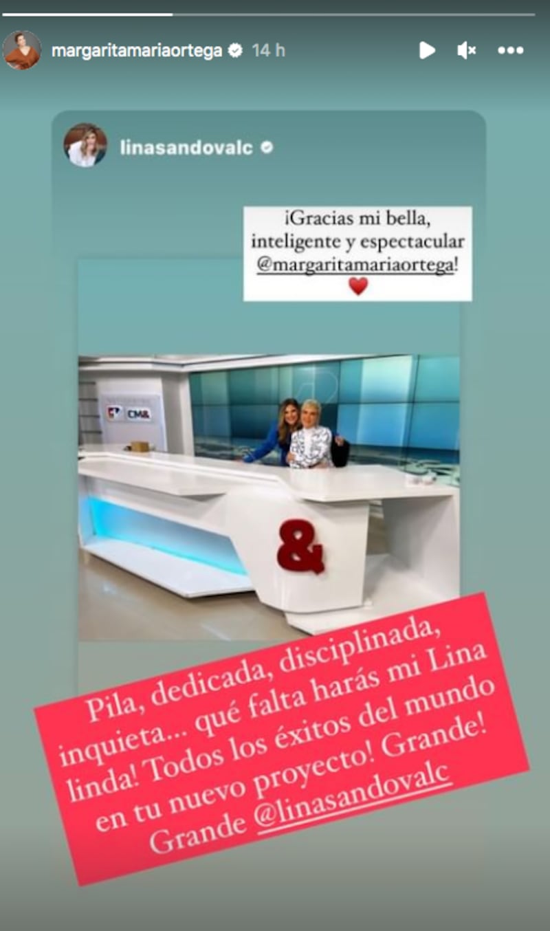 Ante el hecho, las palabras por parte de Margarita no se hicieron esperar demostrándole todo su cariño: “Pila, disciplinada, bella, inquieta… que falta harás mi Lina linda”. Asimismo, la caleña no dudó en enviarle los mejores deseos a su colega, reiterando la admiración que siente y que estará segura de que seguirá brillando en este nuevo rol.
