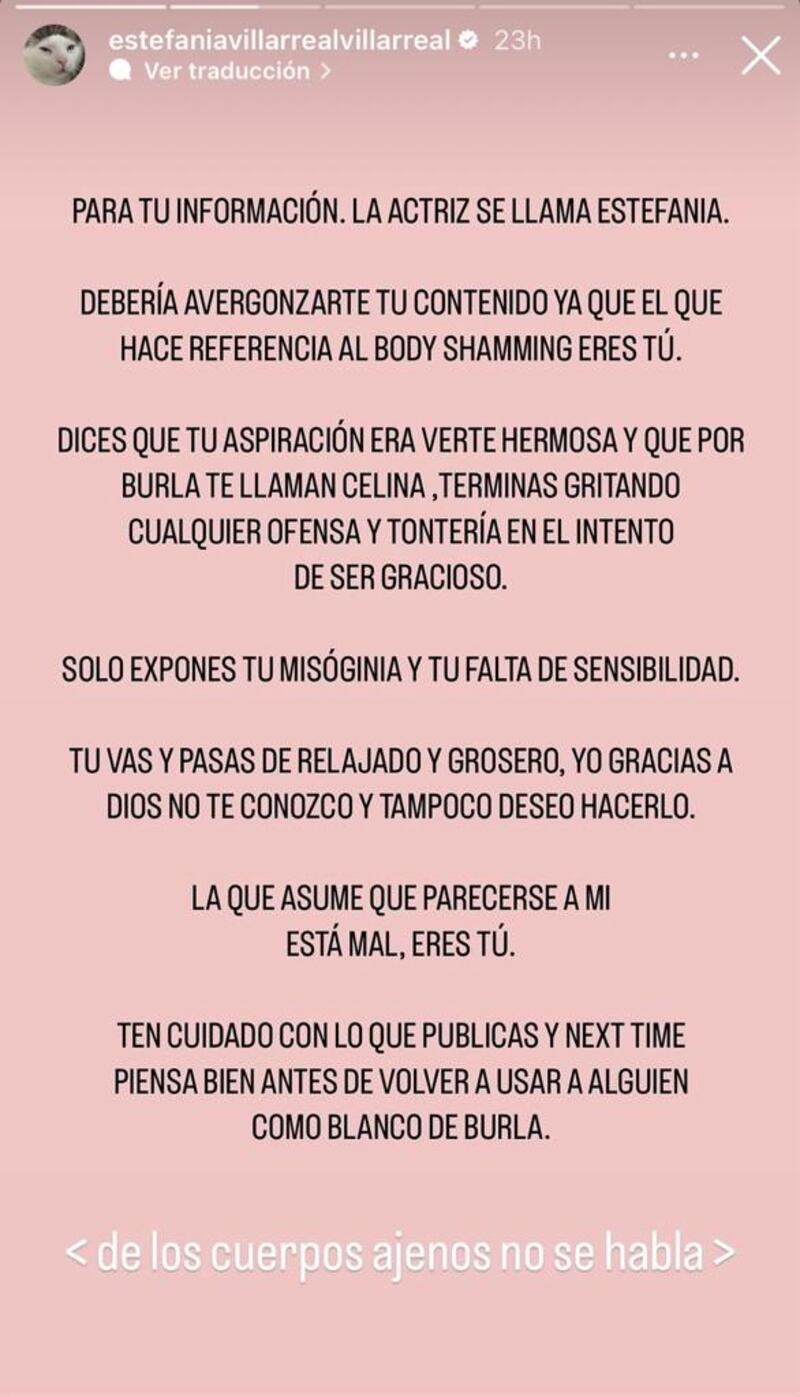 “Para tu información, la actriz se llama Estefanía Villareal. Debería avergonzarte tu contenido ya que el que hace referencia al body shaming eres tú. Dices que tu aspiración era verte hermosa y que por burla te llaman Celina, terminas gritando cualquier ofensa y tontería en el intento de ser gracioso. Solo expones tu misoginia y tu falta de sensibilidad. Tu vas y pasas de relajado y grosero, yo gracias a Dios no te conozco y tampoco deseo hacerlo. La que asume que parecerse a mí está mal eres tú. Ten cuidado con lo que publicas y next time piensa bien antes de volver a usar a alguien como blanco de burla”, escribió la actriz en Instagram.