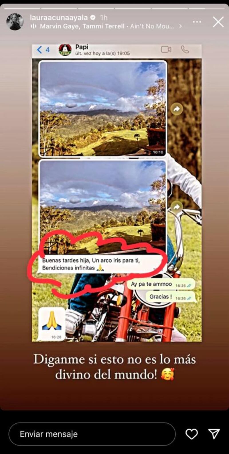 En los últimos días, Acuña compartió una conversación que tuvo con su padre a través de WhatsApp, en la que deja claro la excelente relación con la que cuenta, pues en medio de esta se lee: “Buenas tardes, hija. Un arcoiris para tí, bendiciones infinitas”. Asimismo, la presentadora no dudó en sacar a flote todo el amor que siente por su padre y de paso agradeciéndole por aquellas imágenes que muestran el gran paisaje que podrían visualizar a diario sus padres.