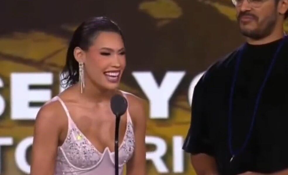 La intérprete de ‘La Cachera’ y ‘La Voa Hace Boja’ presentó una de las categorías, específicamente el “Álbum de Jazz Latino/ Jazz” y al anunciar a los ganadores debía pronunciar una frase en inglés, pero no la pudo culminar y resolvió a su manera.