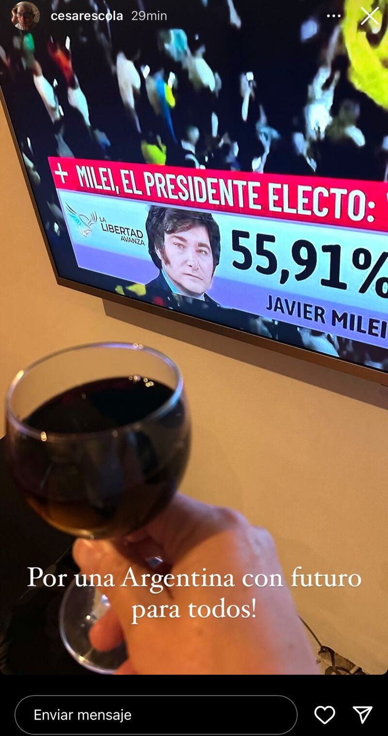 Pero, una opinión diferente se dio por parte de César, quien a través de su cuenta de Instagram no solo compartió que estuvo al frente de la pantalla desde el primer momento siguiendo los resultados, sino también como terminó celebrando el triunfo de Milei: “Por una Argentina con futuro para todos”, sus palabras estuvieron acompañadas de una copa de vino.