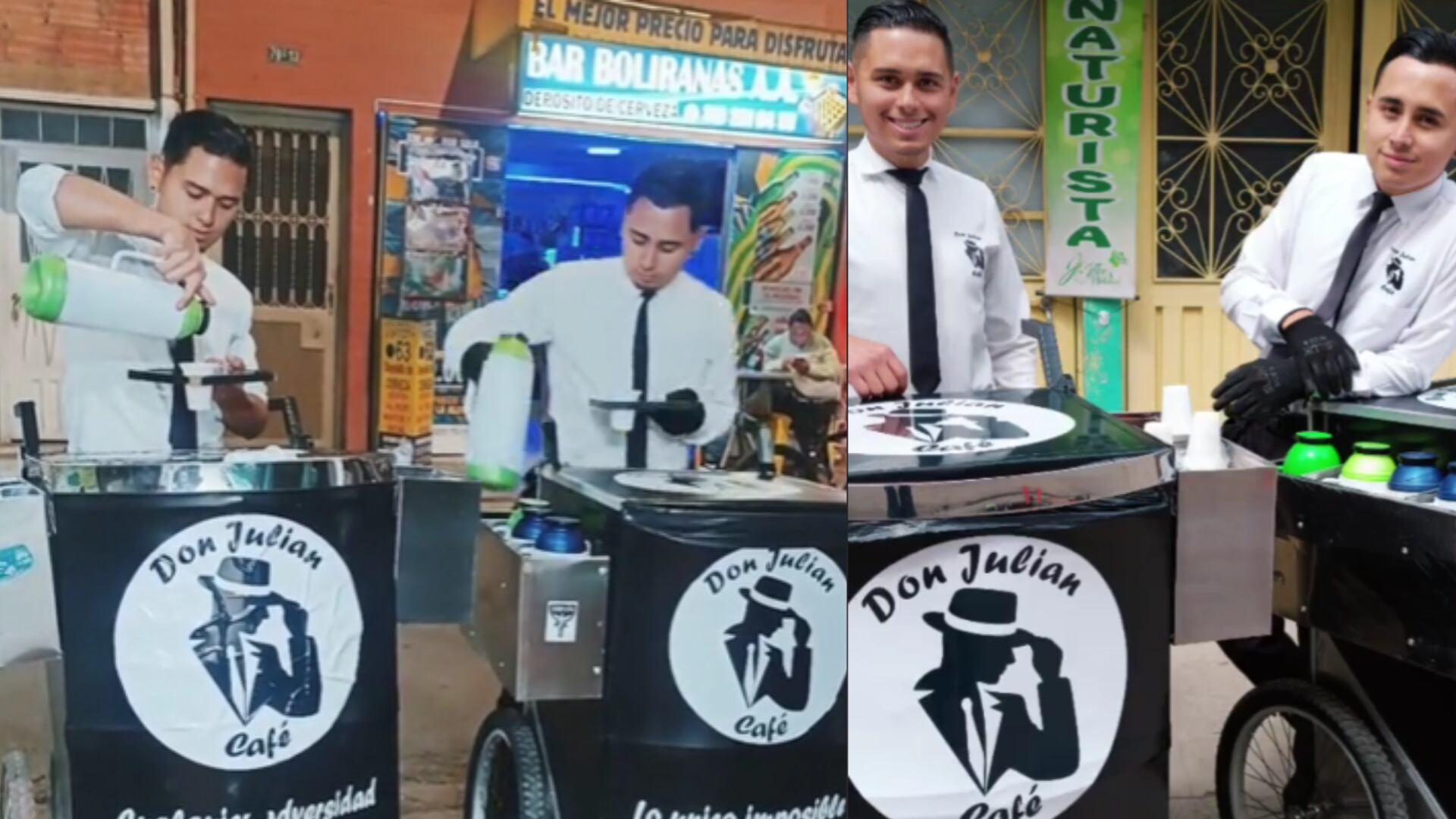 ‘Don Julián Café', es el nombre del negocio ambulante de dos hombres que, vestidos de traje y corbata, se han dado a la tarea de ofrecer una gran variedad de bebidas calientes y frías en la capital colombiana, transportadas en sus carritos, en los que reposan las frases: “Cualquier adversidad contiene la semilla de una ventaja equivalente” y “Lo único imposible es aquello que no intentas”; elementos de trabajo que al igual que sus poseedores también están totalmente relucientes.