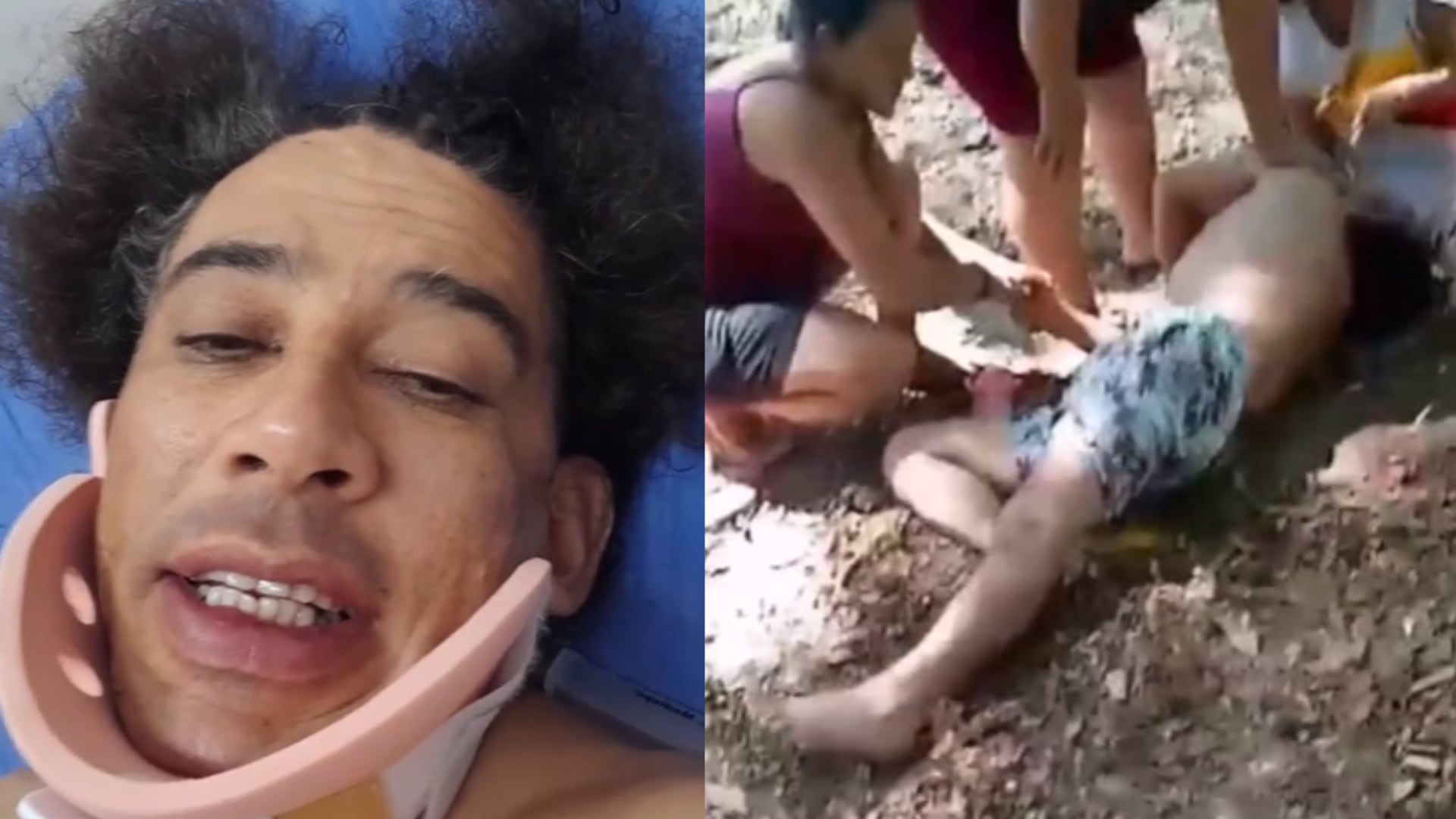 En las imágenes se observa a ‘Bultico’, tirado en el suelo y siendo asistido por algunas personas con las que estaba realizando un compartir; quienes trataban de despertarlo luego de haber quedado inconsciente. Todo esto tras caer de un árbol de mango, a una altura superior a los cinco metros.