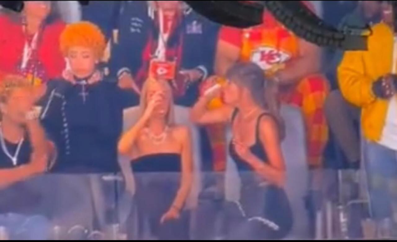 Antes de que comenzará el show de medio tiempo, Taylor fue captada por la cámara del estadio, demostrando que le gusta enfiestarse.