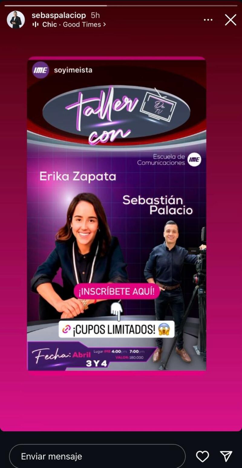De acuerdo con lo compartido a través de Instagram, se dio a conocer el nuevo rumbo que le busca dar a su carrera, pues junto a su compañero de Noticias Caracol, Sebastián Palacio, estará dictando un taller bajo la dirección de Escuela de Comunicaciones IME que tiene su sede principal en Medellín.