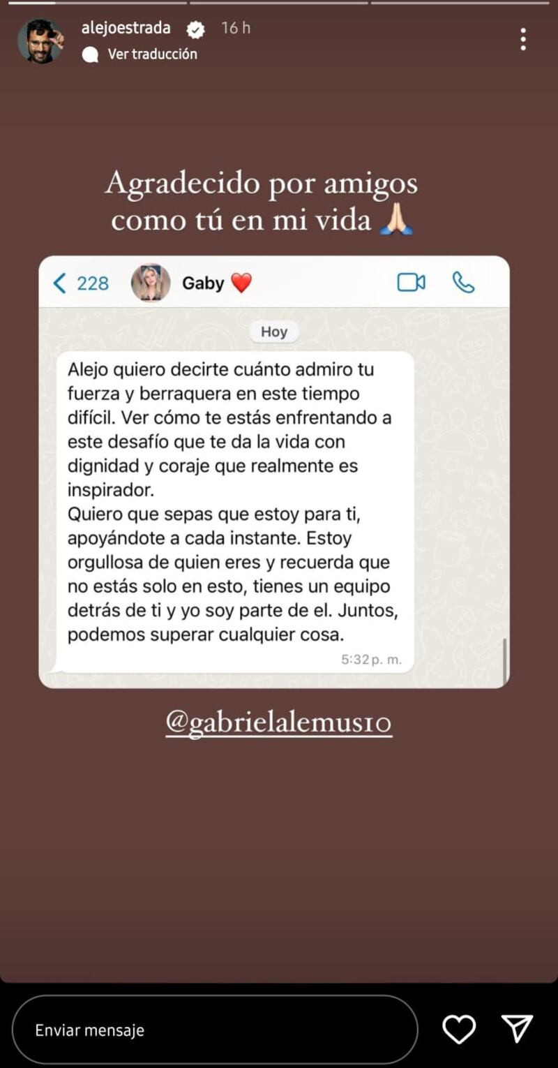Como respuesta Alejandro comentó “Agradecido por amigos como tu en la vida”. Enfatizando la amistad que llevan desde hace un tiempo. La amiga que le brindó estas sentidas palabras es Gabriela Lemus Medina, quien en su Instagram menciona que es emprendedora digital, periodista y Virreina Miss Teen Universe Colombia 2023 - 2024.