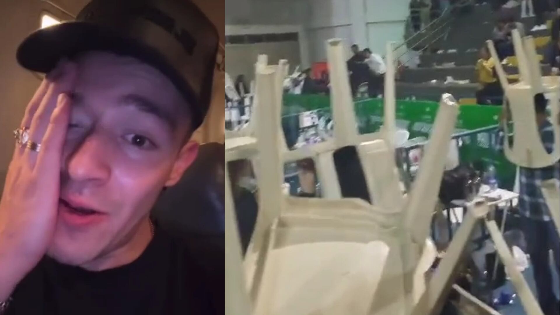 Mediante un clip, ambos representantes del género dieron a conocer que también optaron por pagar un vuelo chárter, pero una negativa de permiso de la aeronáutica también les impidió ejecutar esta posibilidad. Mientras estas explicaciones eran emitidas, algunos asistentes al recinto estaban realizando algunos desmanes, lanzando sillas y botellas a la tarima.