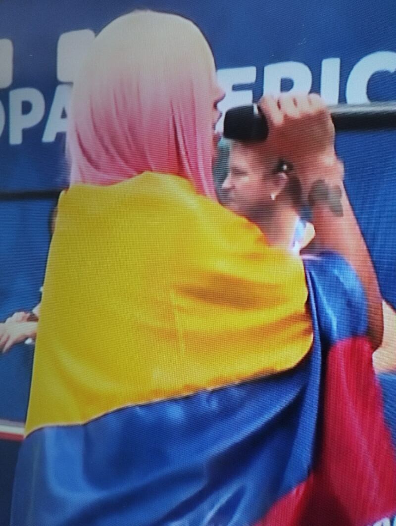 Karol G lució su cabello color rosa peinado liso en el estadio y vistiendo unos short, portando la bandera colombiana. Allí con micrófono en mano canto parte del himno en el ensayo.