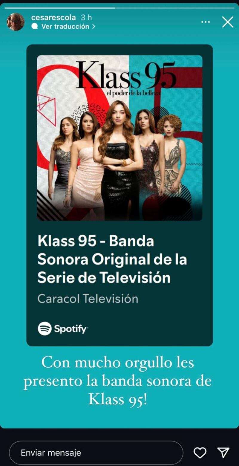 “Con mucho orgullo les presento la banda sonora de ‘Klass 95′”, agregó César Escola evidenciando que la respectiva canción ya se encuentra disponible en ‘Spotify’ para quienes quedaron enganchados con la pieza musical de esta producción que se estrenó este 20 de agosto luego de la gran final de ‘Pedro el escamoso 2′, recibiendo así una amplia acogida por parte de los televidentes.