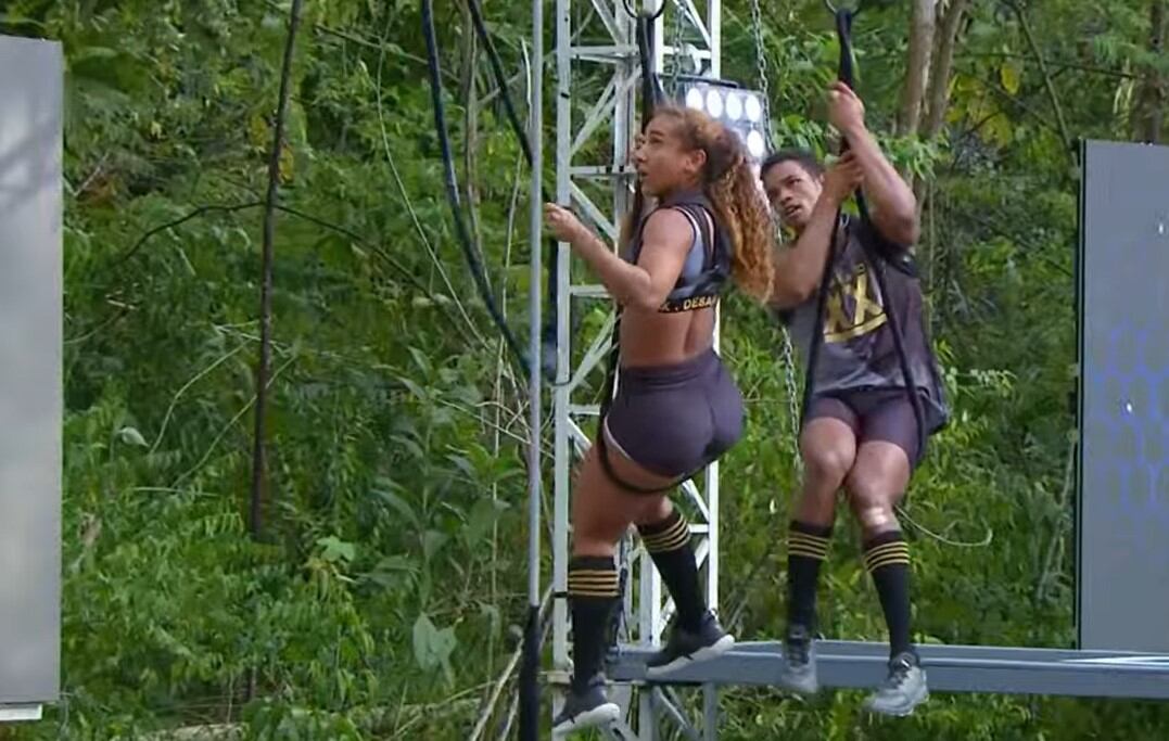 Cada pareja debía partir desde una soga para lanzarse a una plataforma inestable desde la cual tenían que alcanzar otra soga para llegar al descanso en el que los esperarían tres lazos sobre los que tenían que colgarse de una serie de ganchos que tenían que pasar uno a uno.