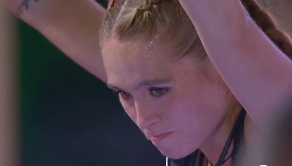 Darlyn fue la primera en llegar a la plataforma superior, por lo que de inmediato se subió al carrito con el que se deslizaría a uno de los extremos tomándole nuevamente ventaja a Guajira quien seguía luchando en la estructura de varas.