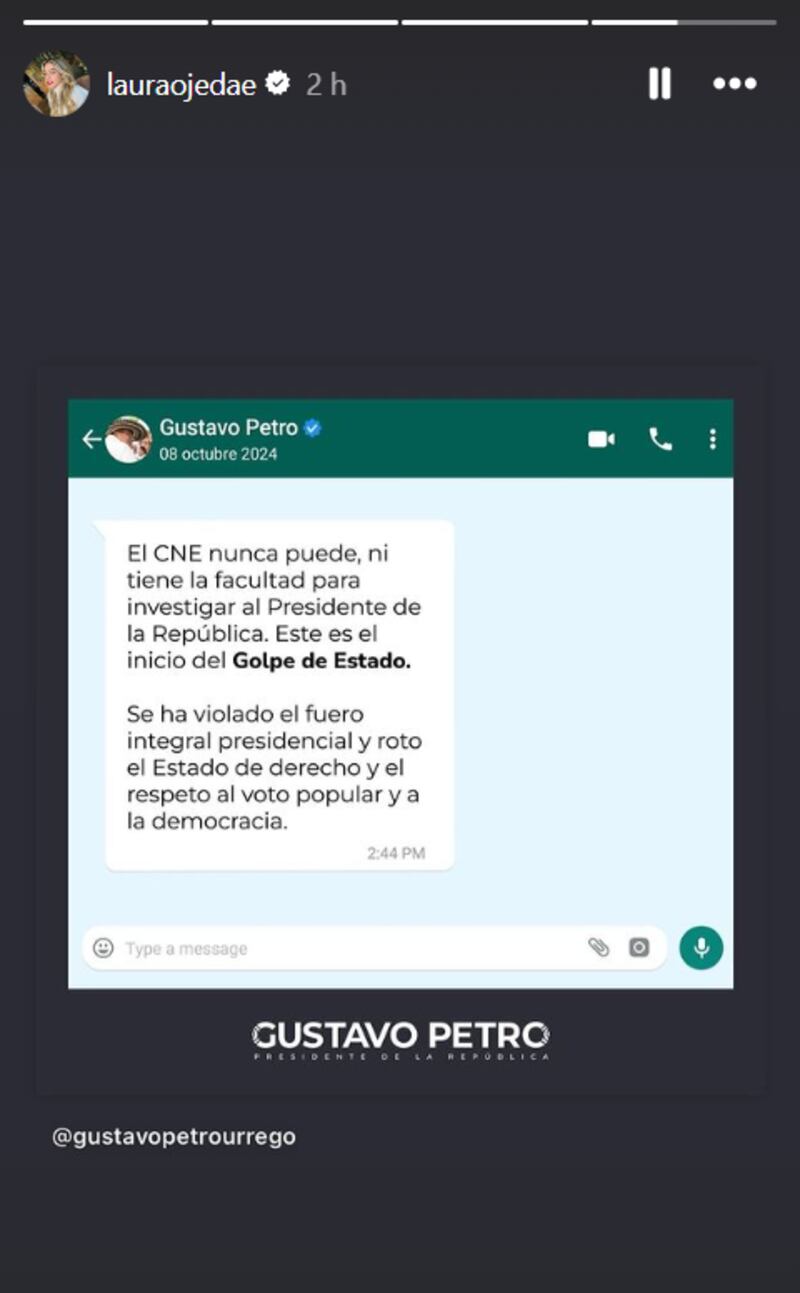 La etiqueta ‘Golpe de Estado’, volvió a convertirse en tendencia en las redes sociales, luego de que el presidente Gustavo Petro reaccionara de manera contundente a la decisión del Consejo Nacional Electoral -CNE, que decidió formularle cargos por presunta superación de topes en su campaña en 2022. Al respecto son muchos los personajes que han decidido mostar postura, dentro de ellos su nuera Laura Ojeda, pareja del hijo mayor del mandatario Nicolás Petro.