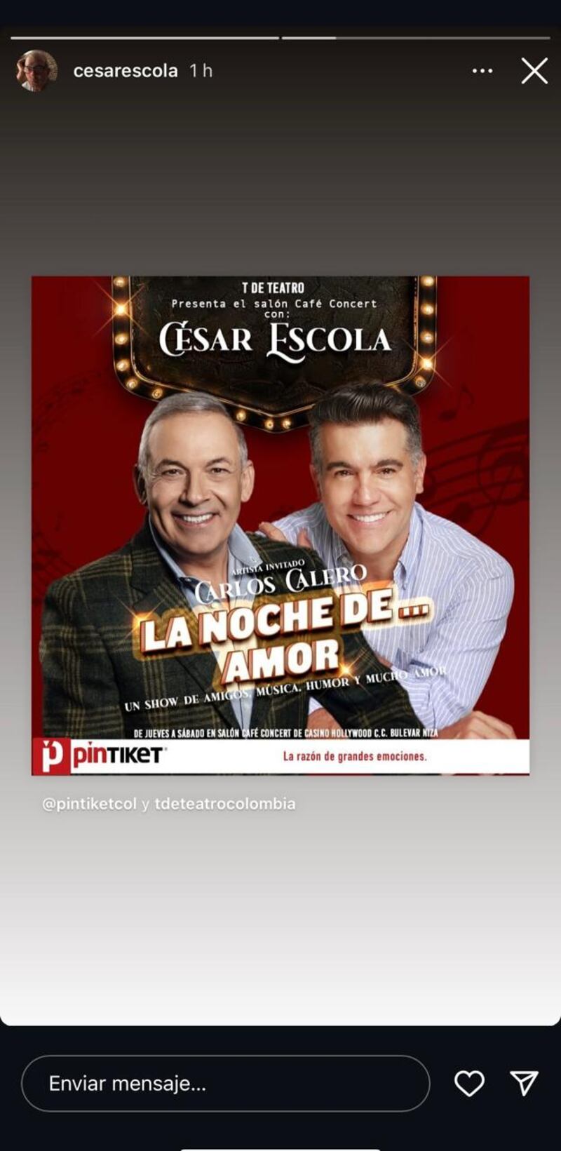 Si bien, el jurado de ‘Yo me llamo’ no suele ser muy activo en sus redes sociales, lo cierto es que recientemente emocionó a sus seguidores, contando así con un nuevo proyecto musical, más conocido como ‘La noche de amor’, “un show de amigos, música, humor y mucho más”. Este mencionado evento se llevará a cabo en el Casino Hollywood de Bulevar Niza, contando así no solo con la presentación de César Escola, sino también de Carlos Calero, Nathalia Gutiérrez, Michelle Santos y Marcela Moreno.